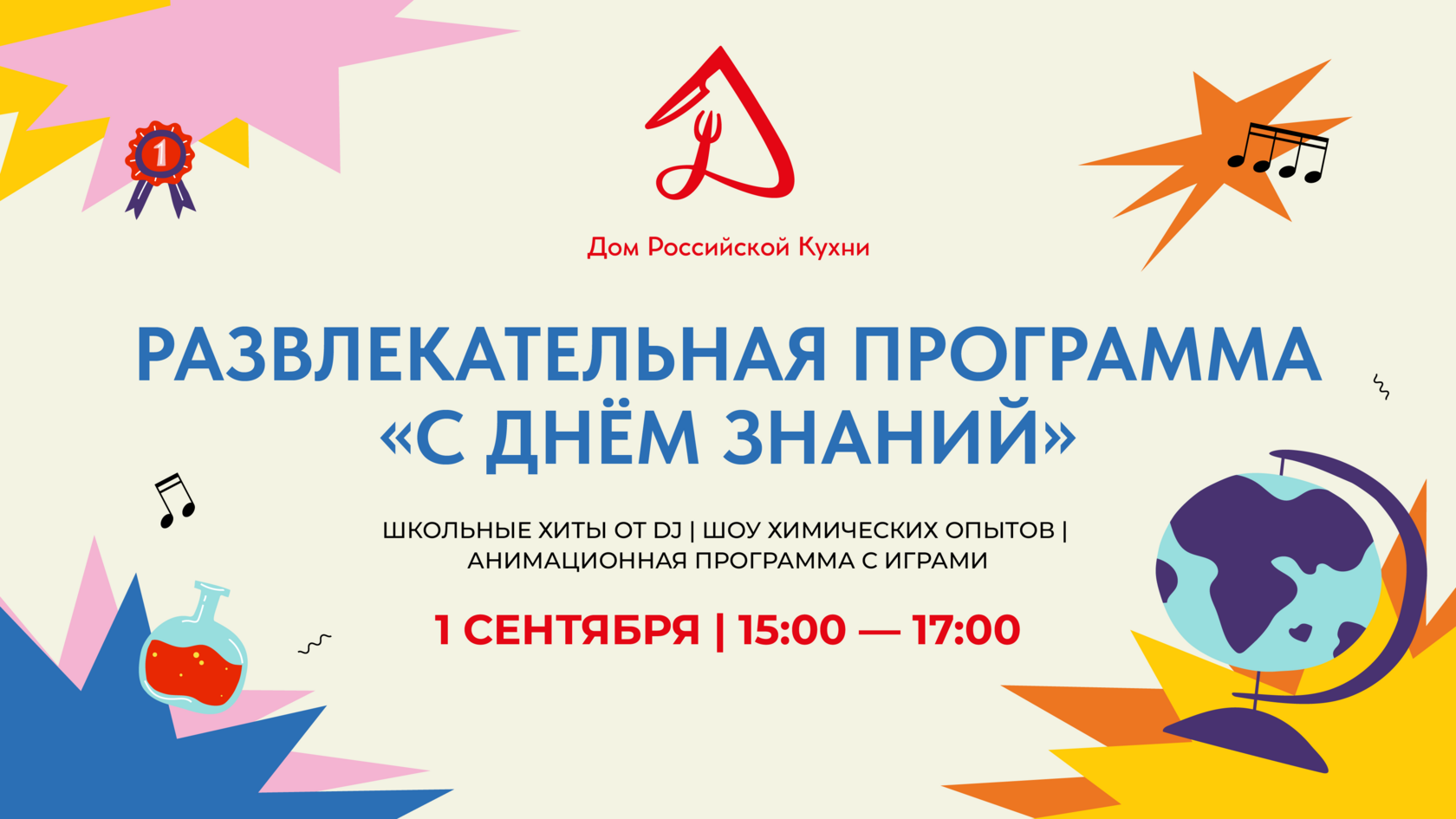 День знаний всегда был особенным праздником для всех, кто связан с образованием. В этот день для тех, кто уже начал свой школьный путь и кому ещё предстоит стать первоклассником в 15:00 на сцене «Дома Российской Кухни» начнётся развлекательная программа. Откроет её «Шоу химических элементов». Участники погрузятся в мир удивительных превращений и ярких реакций: узнают как простые вещества превращаются в фантастические фейерверки, почувствуют магию науки и откроют для себя тайны химии в увлекательной игровой форме. С 16:00 праздник для школьников и их родителей продолжит анимационное шоу с известными героями мультфильмов и сказок. В этот час каждый почувствует себя героем своей сказки. На протяжении всей программы для гостей фудхолла будут звучать зажигательные композиции о школе, детстве, а также современные поп-хиты от приглашённого диджея.